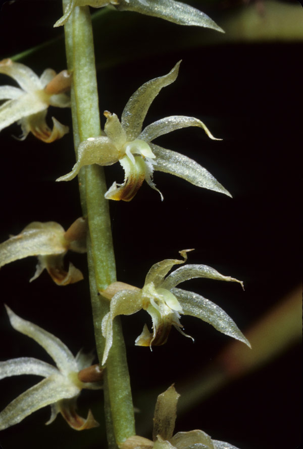 Found in Borneo in low open kerangas, low montane and sandy forests at elevations of 300 to 1350 meters as a small sized, hot to cool growing epiphyte or rarely terrestrial with much branched rhizomes with close set, at an acute angle to the rhizome, fusiform to narrowly oblong, smooth pseudobulbs carrying a single, apical, erect, narrowly linear, slightly dilated at or above the middle, obtuse and minutely apiculate, thin textured, 5 main nerved leaf that blooms on a filiform peduncle, 1.2 to 2.4" [3 to 6 cm] long, rachis narrowly quadrangular, 2 to 3" [5 to 7.5 cm] long, subdense to rather laxly many flowered inflorescence with ovate elliptic, acute bracts and ovate, apiculate, single nerved floral bracts.