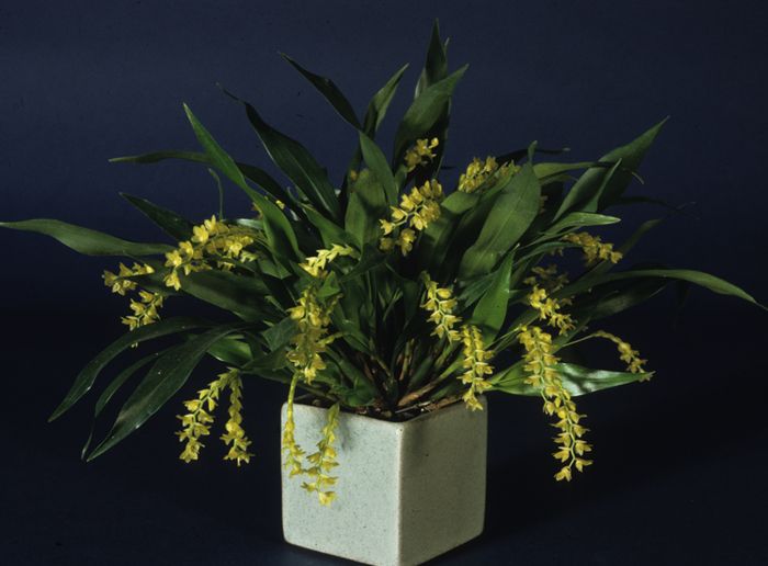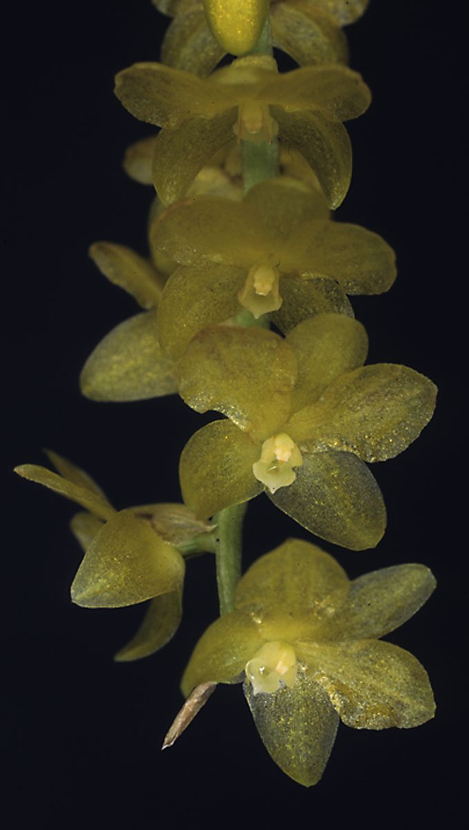 Found in the Philippines at elevations around 500 meters as a small sized, warm growing epiphyte with slender, tapering at both ends pseudobulbs carrying lanceolate, 3 to 5 veined leaves thqat blooms in the late winter and early spring on a 2 to 6" [5 to 15 cm] long, many flowered inflorescence with flowers that open from the apex of the stem first back to the base.