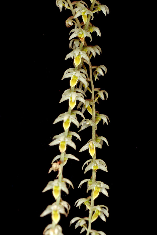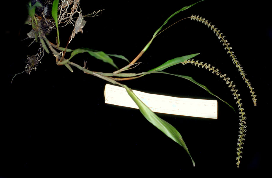 Found in Sumatra in forests at elevations around 1280 meters as a small sized, cool growing epiphyte with a branching, faily slender rhizome giving rise to cylindrical, to 2 to 2.4" [5 to 6 cm] apart, swollena bit basally pseudobulbs carrying a single, apical, pendent, papery, oblong-lanceolate, acumiante, narrowing below rather abruptly into the petiolate base leaf that blooms on a slender, peduncle 4" [10 cm] long, 10" [25 cm] long overall, densely many flowered inflorescence with oblong, mucronate, a little longer than the ovary floral bracts carrying greenish white flowers.
