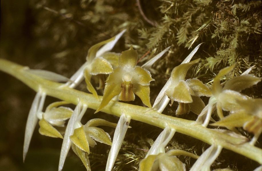 Found in Sumatra in montane forests at elevations of 1600 to 2400 meters as a medium sized, cool to cold growing epiphyte with narrowly cylindrical pseudobulbs carrying a single, apical, erect, linear-lanceolate, acute, 9 to 11 nerved, narrowing below into the petiolate base leaf that blooms in the fall on a 1.6 to 3.2" [4 to 8 cm] peduncle, laxly many flowered inflorescence