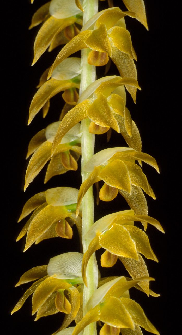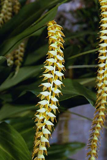 Found in The Philippines in mossy forests at elevations of 1600 to 2000 meters as a medium sized, cool growing epiphyte with elongate, pear-shaped pseudobulbs carrying oblong lanceolate, tapering to the apex, conspicuously veined, narrows into the slender, elongate, petiolate base leaf that blooms on an apical, erect then pendant, wiry, 20" [50 cm] long, many flowered inflorescence with the fragrant sweet wheaty to spicy scented flowers arising in rank and file occuring in the spring and fall.