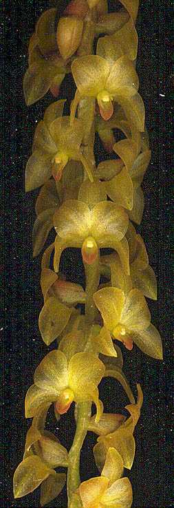 A rare, small sized, cool growing, epiphytic species endemic to the Philippines in montane forests at elevations around 1600 meters with pseudobulbs carrying a single, apical, oblong-lanceolate, acute, 3 veined, petiolate base leaf that blooms in the spring on a 2 ranked, 11.2" [23 cm] long, successively 10 to 20 flowered, racemose inflorescence.