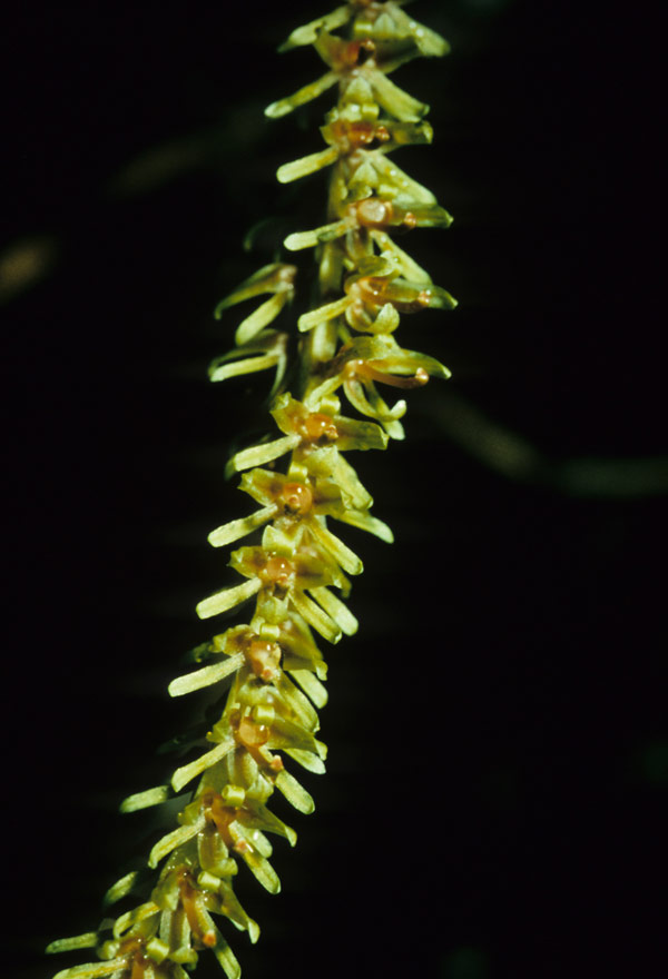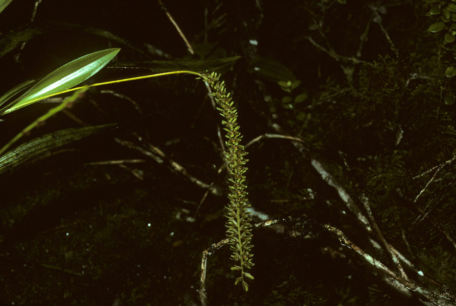 Found in Sumatra on stunted trees close to the ground in montane grasslands at elevations of 2300 to 2800 meters as a miniature to just small sized, cold growing epiphyte with a short, branching rhizome with close set, ovoid to cylindrical, , poale yellowish pseudobulbs carrying a single, apical, erect, narrowly elliptic, acute, petiolate base leaf that blooms on an erect, arising just as the leaves are fully developed, peduncle flattened, 3.6 to 5.4" [9 to 13.5 cm] long, the rachis arching to pendulous, quadrangular, 3.2 to 4.8" [8 to 12 cm] long, many flowered inflorescence carrying non-resupinate flowers.
