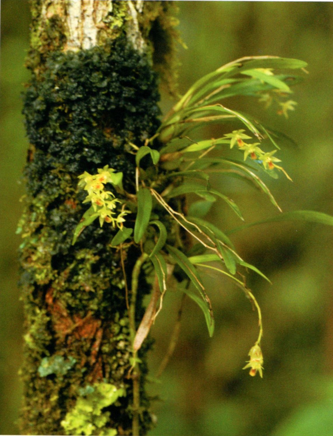 Found in Sabah Borneo in open, low, dry, stunted forestsand in very low, open podosol forests at elevations around 1300 to 1450 meters as a mini-miniature sized, cool growing epiphyte with ovoid to elliptic to oblong-cylindrical pseudubulbs carrying a single, apical, erect, very minutely black punctate-ramentaceous, particularly on the lower surface, narrowly elliptic, obtuse, minutely mucronate, margin minutely papillose, gradually narrowing below into the petiolate base leaf that blooms in the fall on an erect then arching, peduncle .5 to .8" [1.2 to 2 cm] long, filiform, rachis .6 to 1" [1.5 to 2.5 cm] long, quadrangular, sparsely ramentaceous, 5 to 8 flowered inflorescence with oblong-elliptic, acute, concave, sparsely ramentaceous , floral bracts.