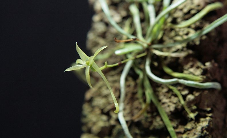 Found in Cuba, Dominican Republic, Haiti and Jamaica in xerophytic coastal thickets and broadleaf limestone forests at elevations of sea level to 950 meters as a miniature to small sized, hot to warm growing epiphyte with flattened gray-green roots that blooms mostly in the summer through fall on 2 to 7, racemose, filiform, 1" [2.5 cm] long, successively single, to 12 flowered inflorescence with broadly ovate, basally tubular, acuminate floral bracts and carrying a single nonresupinate, fragrant flower