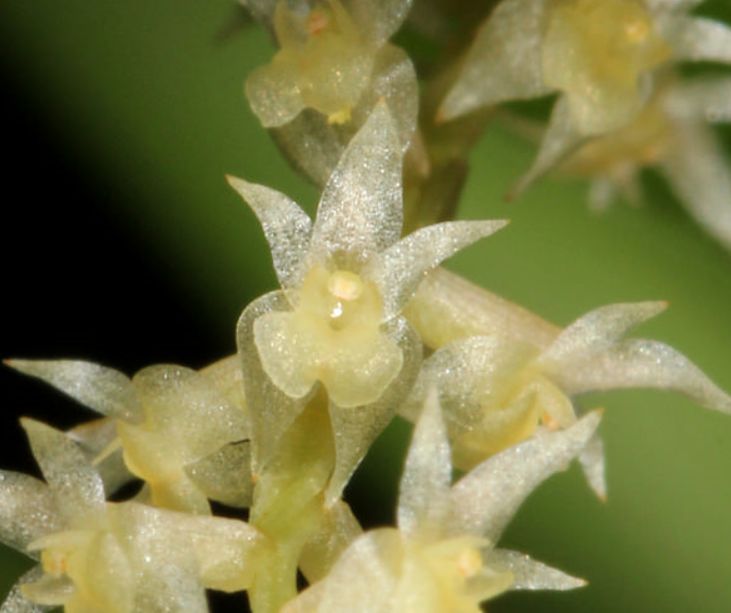 Found in the Philippines in the mountains of Nueva Vizcaya on Luzon on trees and shrubs at elevations around 1200 meters as a miniature to small sized, cool growing epiphyte with tapered, green pseudobulbs carrying a single, apical, erect, narrowly oblanceolate, acute, prominent mid vein leaf that blooms on a glabrous, 2" [5 cm] long, pendent, alternating flowers, rachis twisted so as to produce a cylindrical, simultaneously to 50 flowered inflorescence.