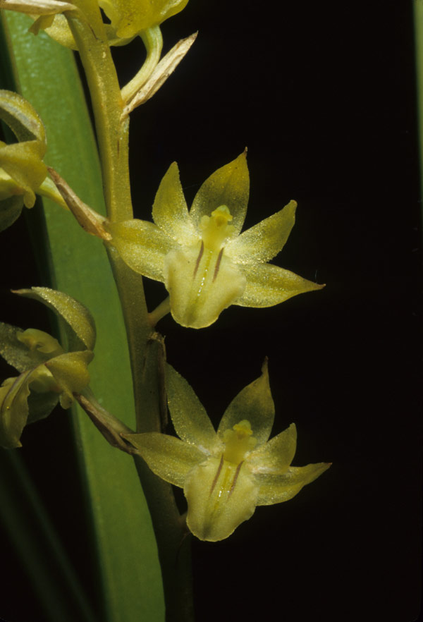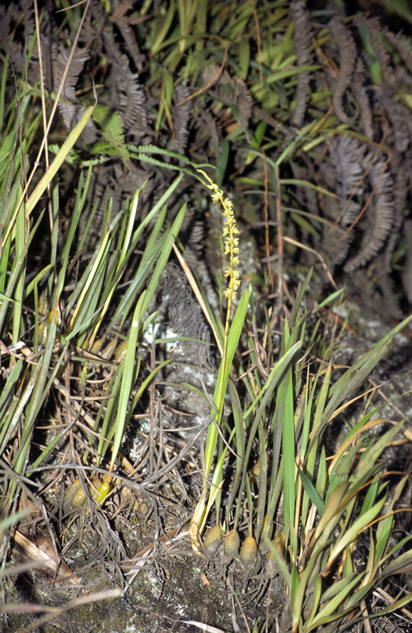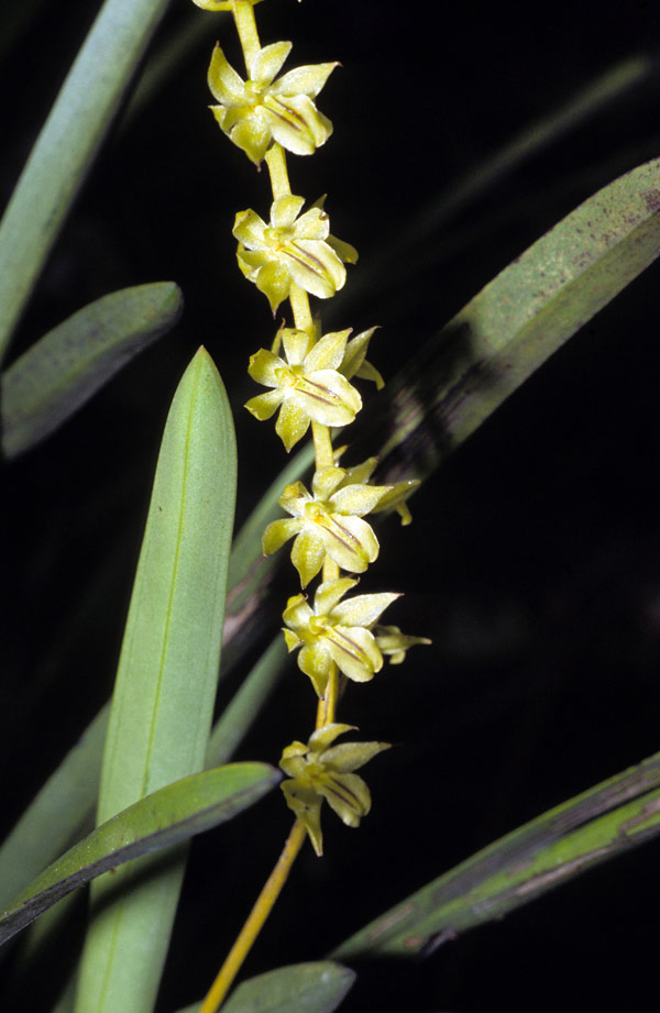 Found in north Sumatra at elevations around 1550 to 2250 meters as a miniature sized, cool to cold epiphyte with a creeping rhizome giving rise to erect, .6" [1.5 cm] between each, thickly ovoid, elliptic in cross-section pseudobulb carrying a single, apical, erect, linear, narrowing apically, obtuse, gradually narrowing below into the petiolate base leaf that blooms in the spring on an erect, arising before the leaves have properly formed, longer than the leaf, peduncle elliptic in cross-section, to 10" [25 cm] long, rachis to 6" [15 cm] long, quadrangular in cross-section, flowers from the base to the apex, many flowered inflorescence.