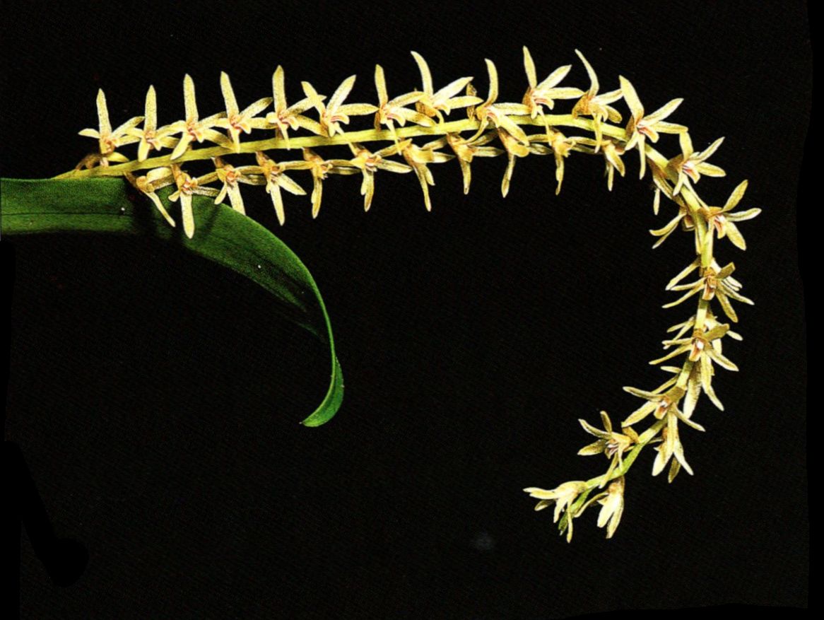 Found in Borneo in lower montane forets, primary forests, rocky places and riparian forests at elevations of 400 to 2000 meters as a mini-miniature to small sized, warm to cool growing epiphyte with .4 to 2.2" [1 to 5.5 cm] between eachterete, narrowly oblong to narrowly fusiform, smooth pseudobulbs carrying a single, apical, ovate ellipticto narrowly ellipitc, often constricted below the apex, acute to shortly acuminate, sometimes narrrowly obtuse, thin textured, 5 to 7 main nerved, sulcate and canaliculate below into the petiolate base leaf that blooms in the spring summer and fall on agerntly curving, peduncle filiform, .8 to 3" [2 to 7.5 cm] long, rachis quadrangular, somewhat compressed, 1.6 to 5.6" [4 to 14 cm] long, laxly to densely many flowered inflorescence with 1 to 6 ovate, apiculate to acuminate bracts and ovate-orbicular to broadly ovate, apiculate acute to sometimes obtuse, concave floral bracts and carrying fragrant flowers.