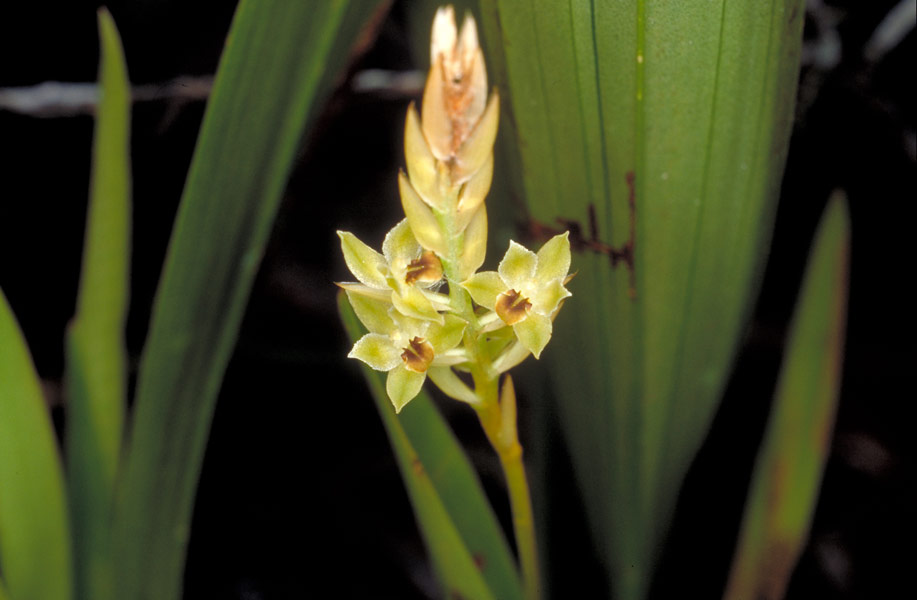 Found in Sumatra at elevations around 1600 to 2200 meters as a small to medium sized, cool to cold growing epiphyte with narrowly conical, close set pseudobulbs carrying a single, apical, erect, oblong-lanceolate, acute to bidentate, broad in the middle, gradually narrowing below into the petiolate base leaf that blooms on an erect, robust, to 16" 4 to 6" [40 cm] long, peduncel longer than the rachis, many flowered inflorescence with lanceolate, acute, boat-shaped floral bracts.