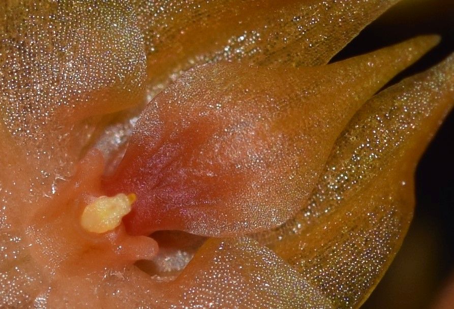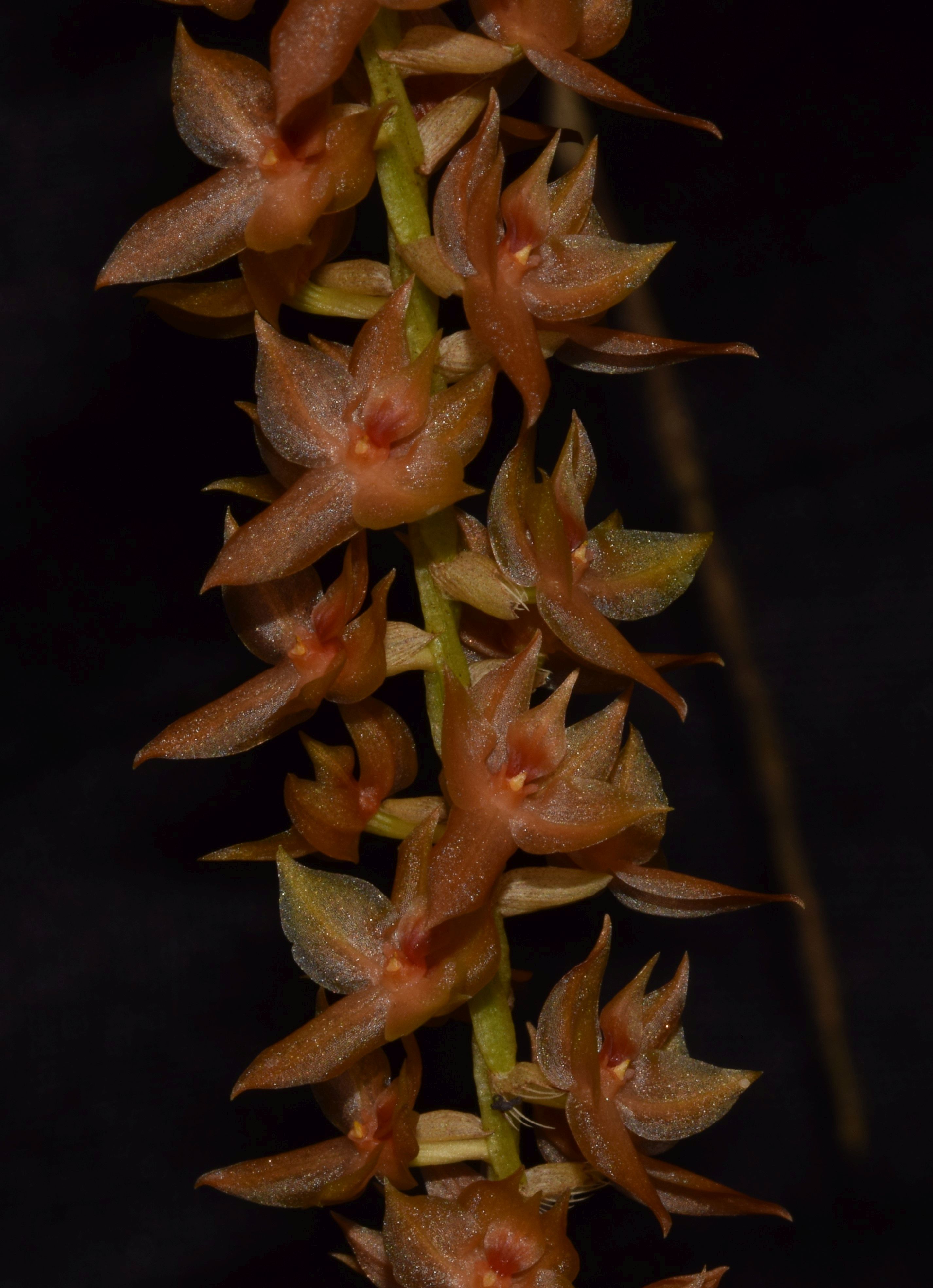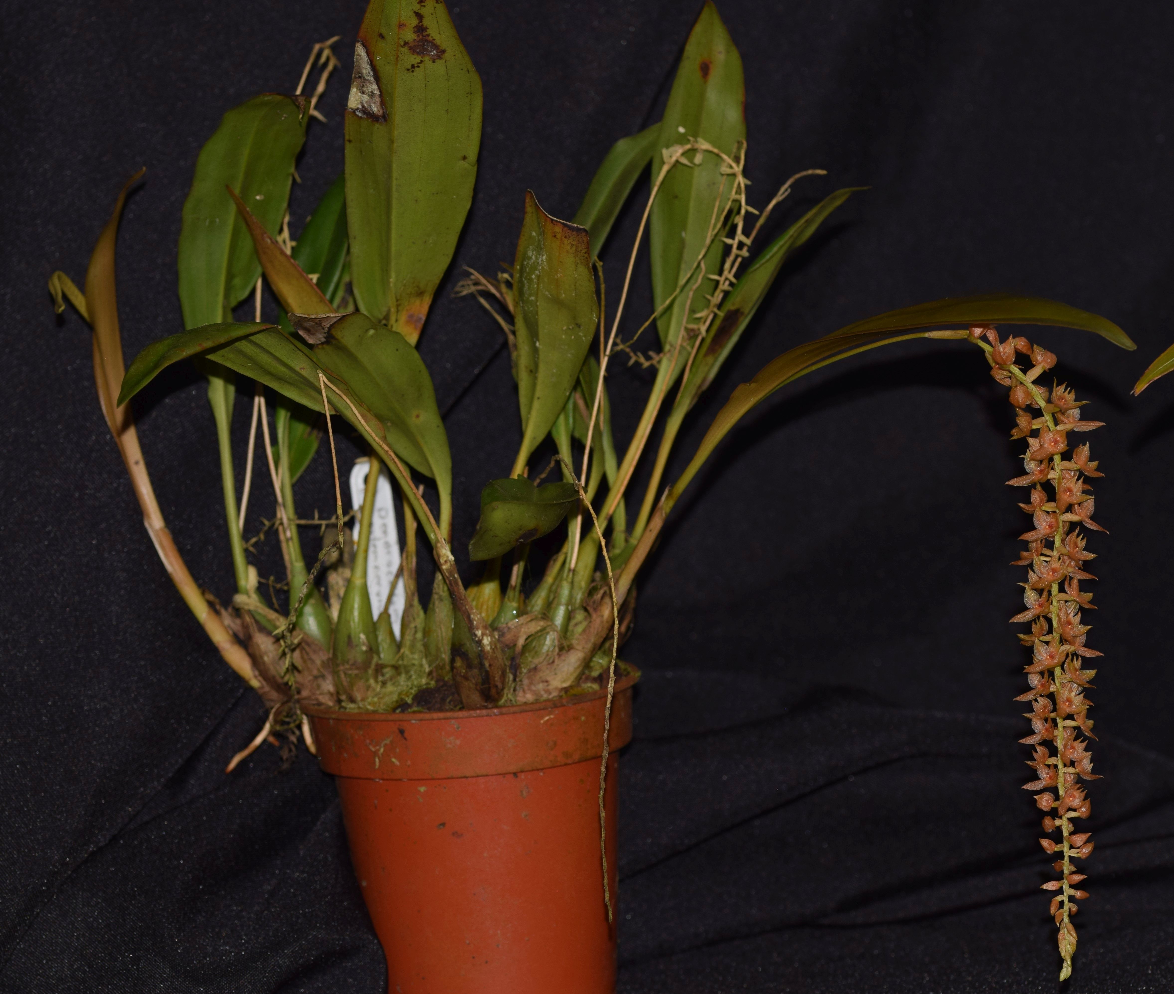 Found in the Philippines on Mindanao island without locational data as a small sized, tufted herb with tightly clustered, fusiform, widest at the base, longitudinally wrinkled-furrowed when dry paeudobulbs enveloped in youth by tubular, obtuse to acute, soon evanescent cataphyls and carrying a single, apical, erect, convolute, dorsiventrally flattened, petiolate base leaf that blooms in the late summer and early fall on a synanthous, racemose, peduncle suberect, arched, 6.52" [16.8 cm] long, slender, subterete, sparsely and finely setose [especially towards the base], rachis pendent, 6.8" [17 cm] long, distichously alternating flowers, rachis axis twisted so as to produce a terete rachis, densely many flowered inflorescence with a single, adpressed, non-floriferous bract. Flowering begins from the central part of the inflorecence and then works out to both ends. The floral bracts are lanceolate-oblong to elliptic to ovate when spread, acute to acuminate, entire, 10 to 12 nerved, finely and sparsely setose floral bracts