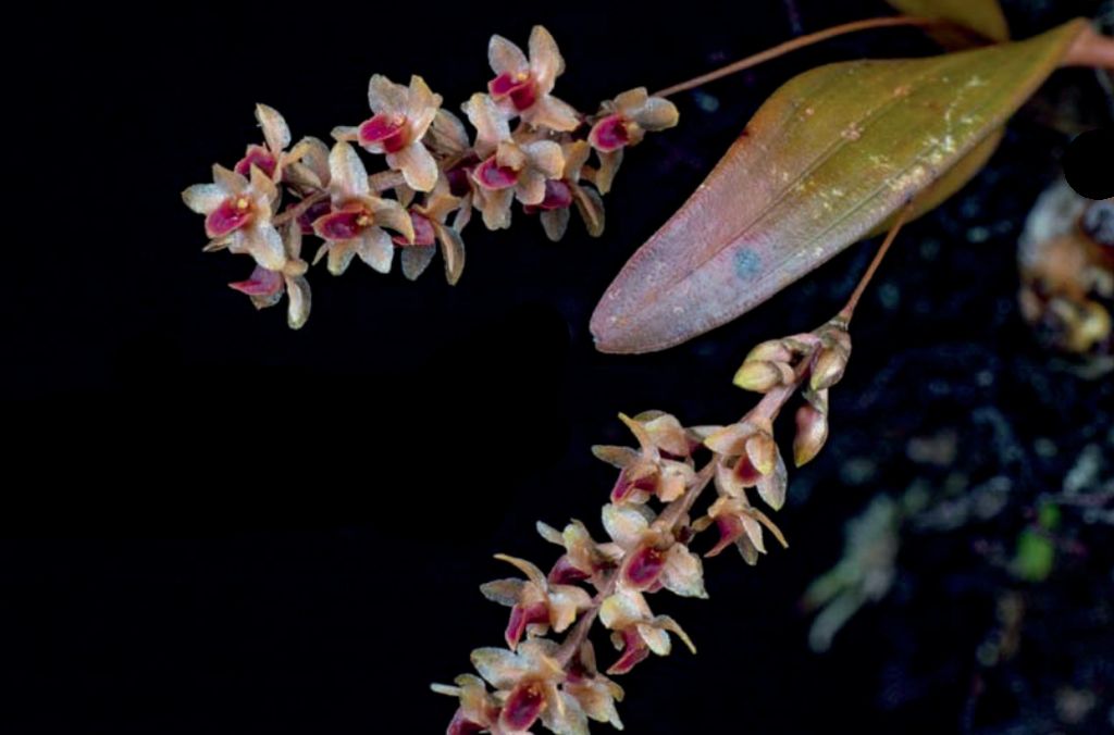 Found in the Philippines on Mindanao Island on moss covered branches at elevations around 1500 meters as a small to just medium sized, cool growing epiphyte with erect, clustered, conical-oblong, wrinkled pseudobulbs enveloped by 3 and carrying a single, slightly plicate, leathery, lanceolate emarginate apically, adaxially and abaxially glabrous, margins entire, single nerved on both sides, acute below into the glabrous, green, grooved, petiolate base leaf that blooms in the late winter and early spring on synanthous, racemose, upright, peduncle acicular, 1.2 to 3" [3 to 5 cm] long, rachis to .8" [2 cm] erect, grooved, up to 17 flowered inflorscence with lunate, 18-nerved, persistent, glabrous, green, longer than the ovary floral bracts and carrying non-resupinate, non-fragrant flowers.