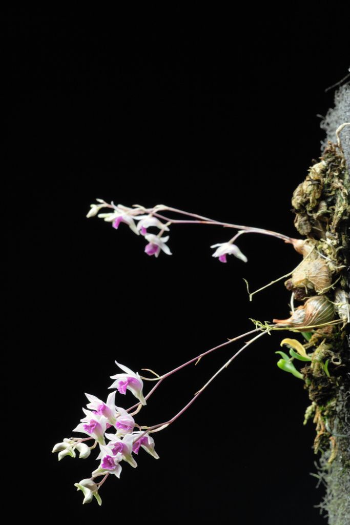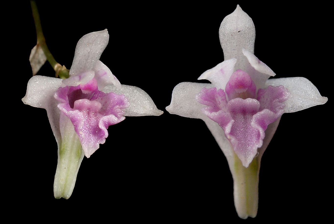 Found in Thailand and possibly Myanmar without habitat details with crowded, erect, to 5 internoded, strongly constricted at nodes, discoid to ovoid-conical, dark green pseudobulbs enveloped by persistent, green turning red-brown sheaths and carrying 2 to 4, apical, spreading, green, deciduous after growing season, oblong to linear, obtuse leaves that blooms in the fall and winter on 1 to several, 1st one terminal others lateral from the nodes near the apex of the pseudobulb, erect to suberect, slender, 2 to 3" [5 to 7.5 cm] long, slightly zig zag, to 8 flowered inflorescence with the lower 2/3 covered by 2 to 3, overlapping, green, cylindrical, loose, narrowly ovate, acute bracts and has a broad lanceolate floral bract and carries very long-lasting flowers