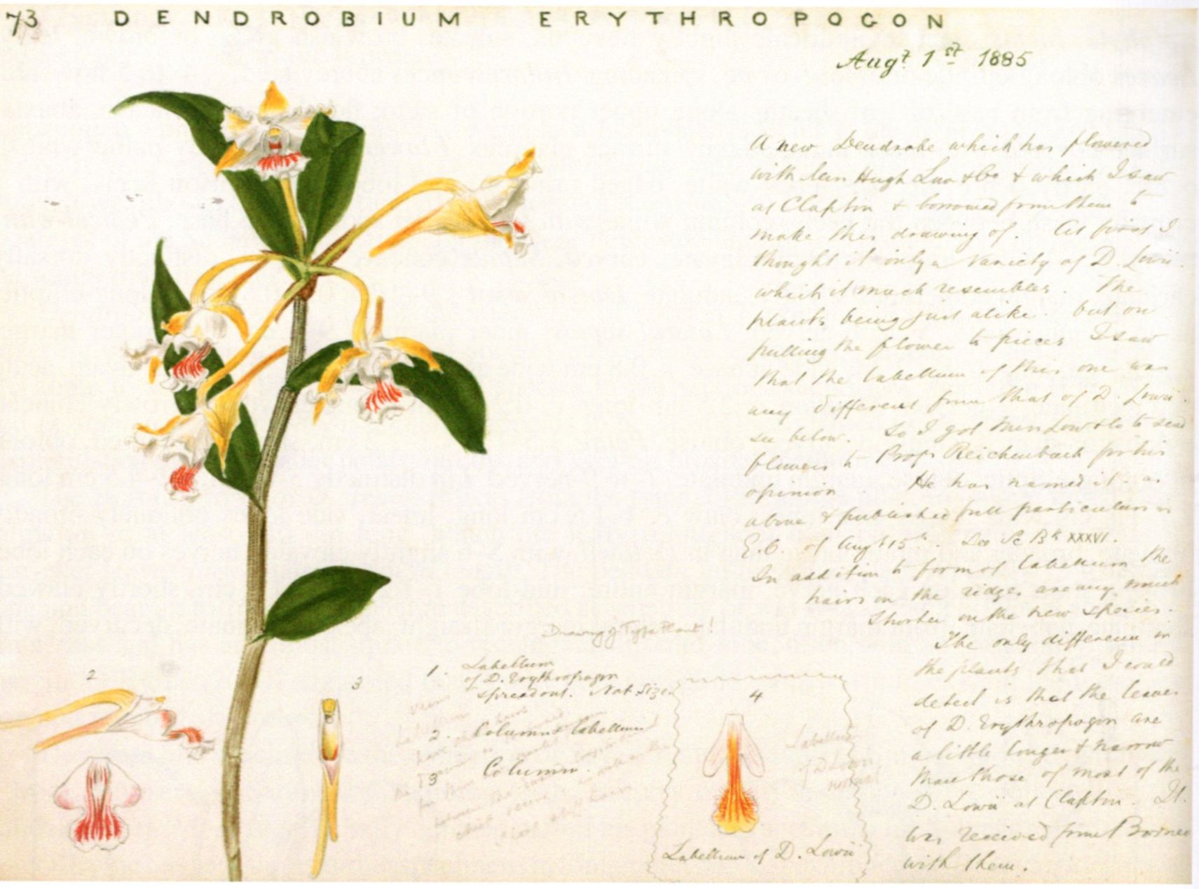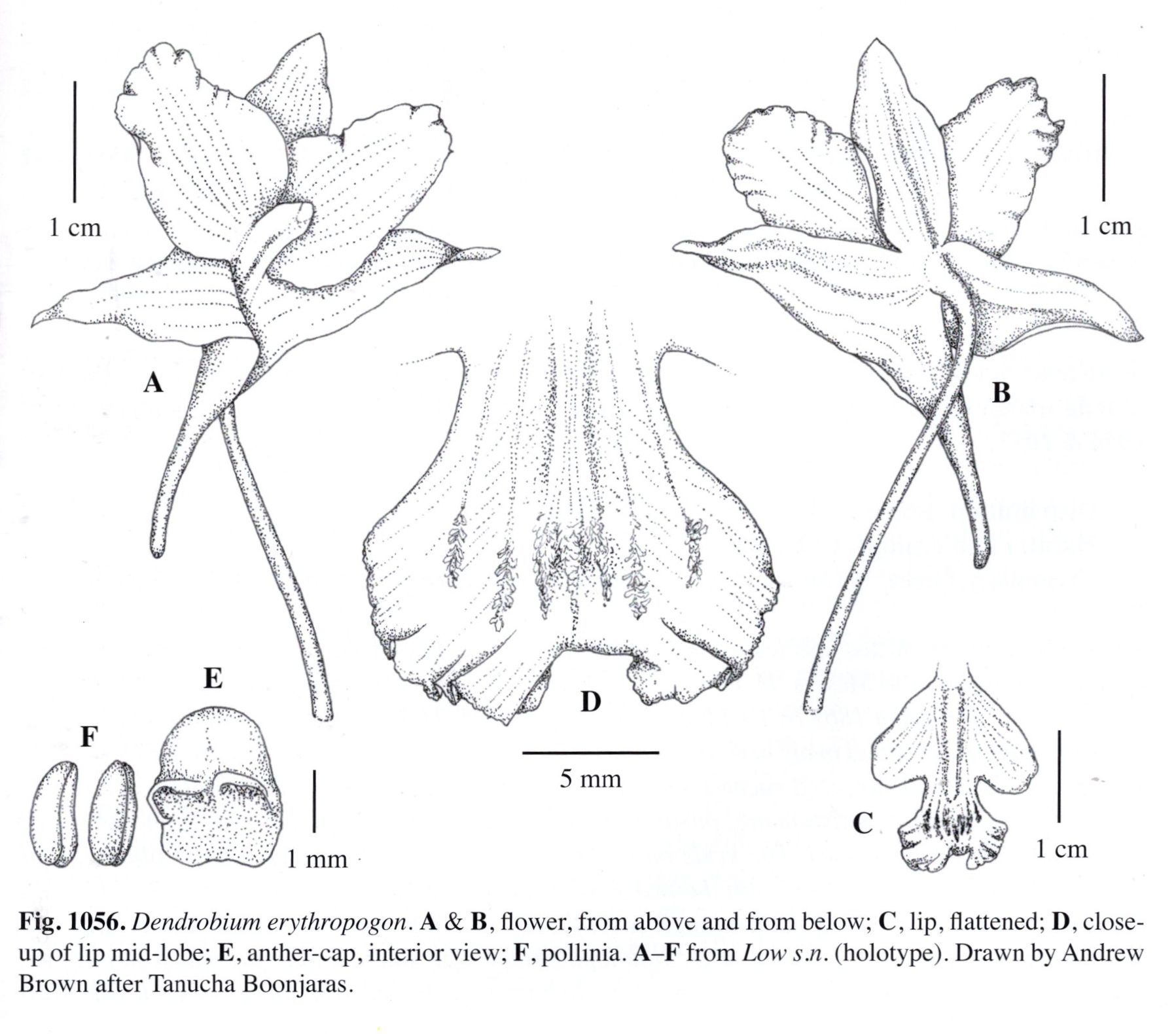 Dendrobium erythropogon Rchb.f. 1885 SECTION Formosae Drawing by John Day Drawing by Andrew Brown Common Name The Red Bearded Dendrobium [refers to the vertical crimson hairs towards the apex of the lip]