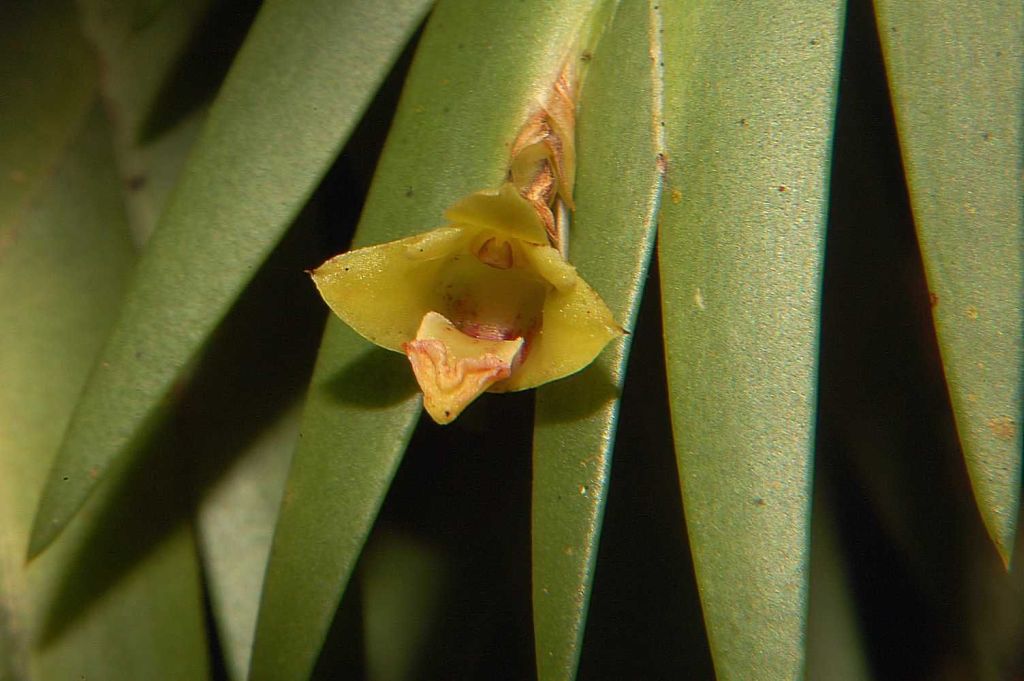 Found in Cambodia, Malaysia, Borneo, Java, Lesser Sunda Islands, Moluccas, Sumatra and New Guinea at elevations of 600 to 1500 meters as a medium sized, warm to cool growing epiphyte with leafy stems carrying many, set at an acute angle to the stem, narrowly triangular, acute leaves that blooms in the fall on a single flowered, from all along the stem, short inflorescence.