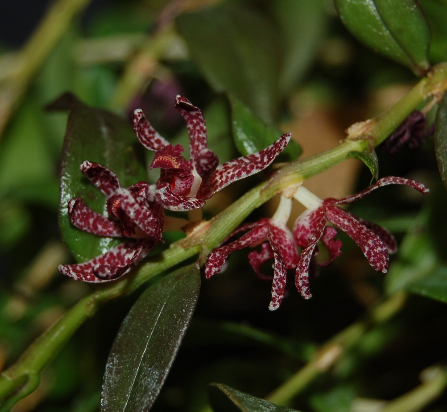 Found in New Guinea on tree on hills at elevations of 50 to 150 meters as a miniature sized, hot growing epiphyte with slightly flattened stems carrying shiny, pale green, tapering narrowly ovate-lanceolate, bidentate apically leaves that blooms in the late winter and early spring on a short, few flowered inflorescence arising from the nodes near the apex opposite the leaves and carrying short-lived flowers