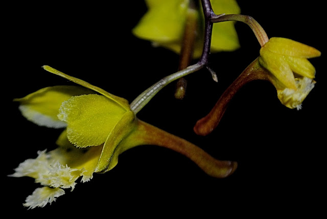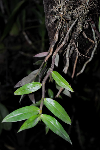 Found in northern Sumatra at low elevations as a small to medium sized, hot growing epiphyte with pendent, terete, basally narrowed, violet reddish brown with age stems carrying many, dark green, deciduous, ovate-oblong, narrowing towards the apex, unequally bidentate apically leaves that blooms in the summer on thin, .52 to .75" [1.3 to 1.75 cm] long, 3 flowered inflorescence arising from the nodes of leafless stems.