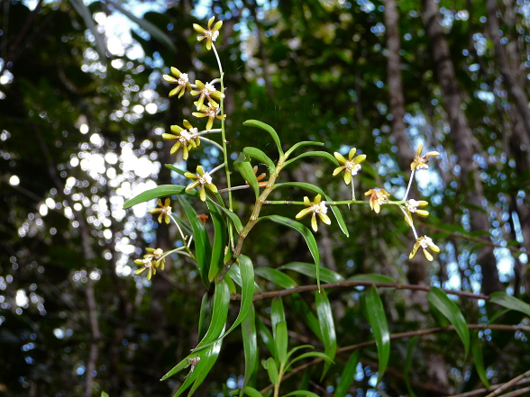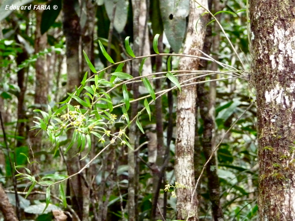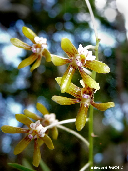 Found in New Caledonia in rain forests at elevations of 150 to 1250 meters as a small to large sized, hot to cool growing epiphyte with clustered, slender, woody, slightly zigzag stems carrying deciduous, spreading to erect, leathery, linear, bilobed leaves that blooms at most any time of the year on several, erect to spreading, racemose, .8 to 1.6" [2 to 4 cm] long, 5 to 20 flowered inflorescence arising on leafy or leafless canes and carry fragrant flowers
