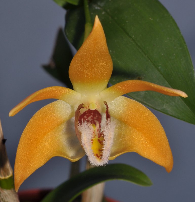 Found in Queensland Australia in rainforests near mountain tops at elevations of 800 to 1500 meters in patchy forests with mist, dew, fogs and low clouds are common as a small sized, cool to cold growing epiphyte or at higer elevations a miniature sized lithophyte with erect to nearly pendulous rugose with age, apically leafy canes with thin, ovate leaves and blooms in the late winter through early summer on a .4 to .8" [1 to 2 cm] long, 1 to 3 flowered inflorescence which emerge from the apical nodes of the stem and carries a few [to 3], spicely fragrant flowers.