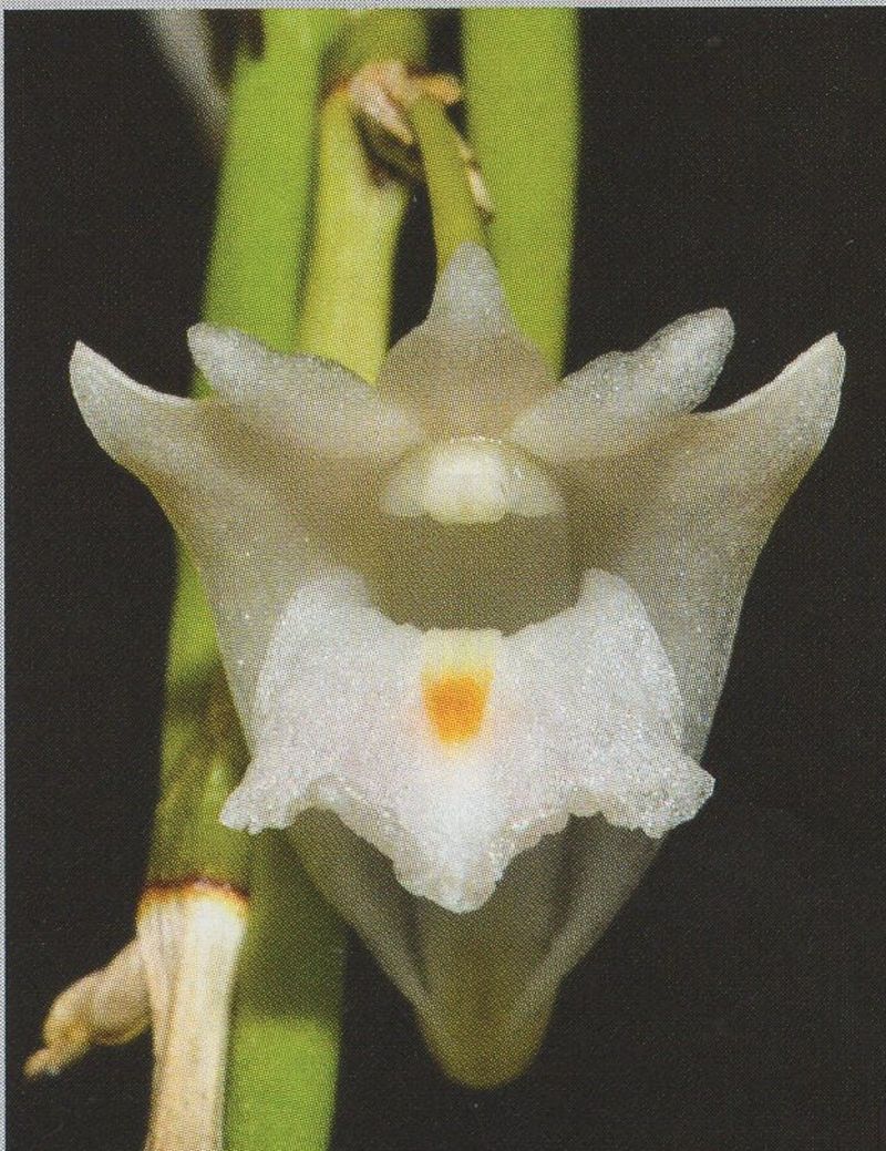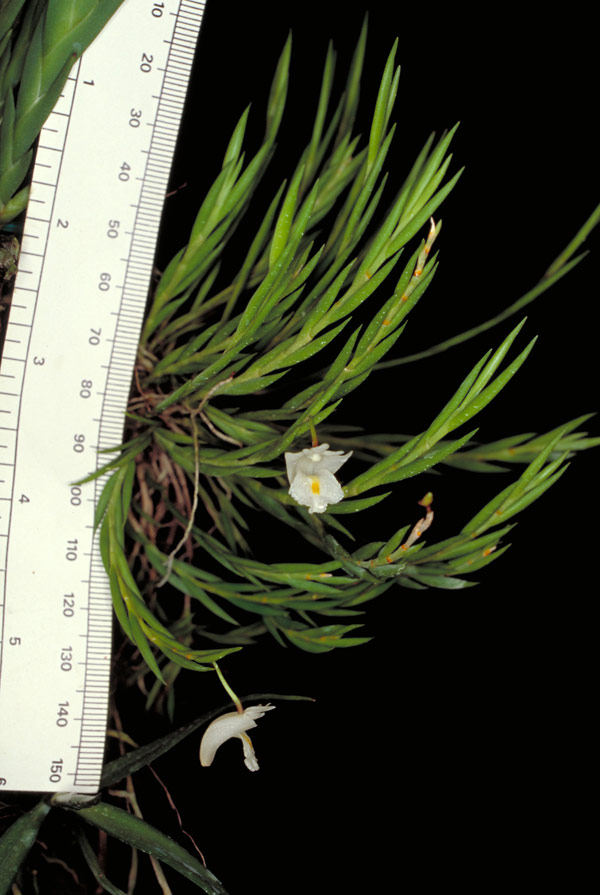 Found in Thailand, Malaysia, Borneo and Sumatra on trees by rivers and in old mangroves at lower elevations to 100 meters as a small sized, hot growing epiphyte with leafy stems for half way and the distal half is leafless and carrying slender, terete, acute, close [adpressed] to the stem leaves that blooms in the fall on a short, arising from the nodes along the leafless upper half of the stem, single flowered inflorescence