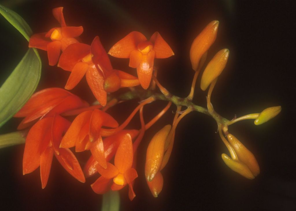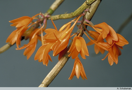 Found in Papua and New Guinea on trees at the edges of forests on exposed ridges at elevations of sealevel to 1300 meters and is a medium to large sized, hot to cool growing epiphyte with slender, branching stems with roots all along and carrying many, alternate, lanceolate, thin, spreading to suberect, bilobed, deciduous leaves that blooms on a 4 to 6" [10 to 15 cm] long, densely many [25 to 35] flowered, racemose inflorescece that arises from nodes all along the leafless cane occuring in the winter and spring with longlasting flowers.