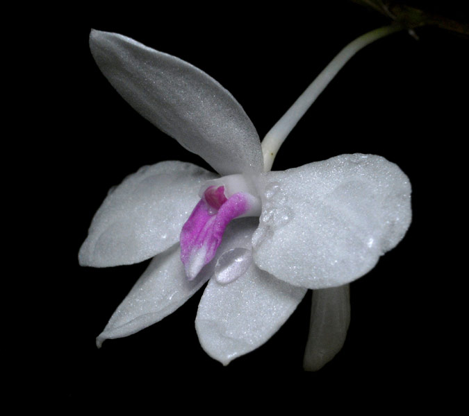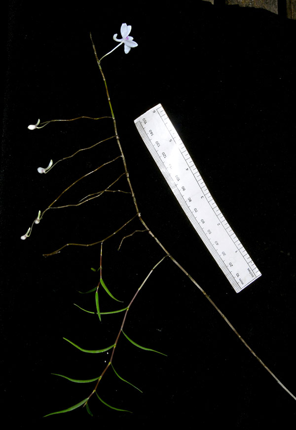 Found in Sulawesi in elfin forests on volcanic slopes usually on tree branches at elevations of 600 to 1800 meters as a small to medium sized, warm to cool growing epiphyte with pendulous, branching, narrow stems carrying distichous, narrow, widely spaced, grasslike, linear to nearly lanceolate, unequally bidentate apically leaves that blooms in the winter and summer on an erect, lateral, 1.5" [3.75 cm] long, 2 to 3 flowered inflorescence arising along the stem to the tip so as to almost appear terminal.