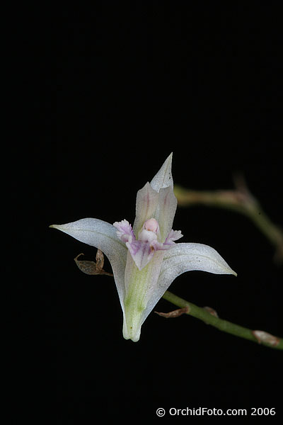 Found only in Thailand in montane forests at elevations around 1800 meters as a mini-miniature sized, cool growing epiphyte with nearly conical to ovoid, clustered, slightly laterally compressed pseudobulbs carrying 2 to 3, apical, arcuate, suberect, thin textured, ovate-lanceolate to ligulate, acute deciduous at blooming leaves that blooms in the summer and fall on an erect to suberect, terminal to subterminal, slender, .8 to 2" [2 to 5 cm] long, basically simultaneously 3 to 9 flowered inflorescence arising from near the apex of the pseudobulb and carryijng campanulate, faintly fragrant flowers