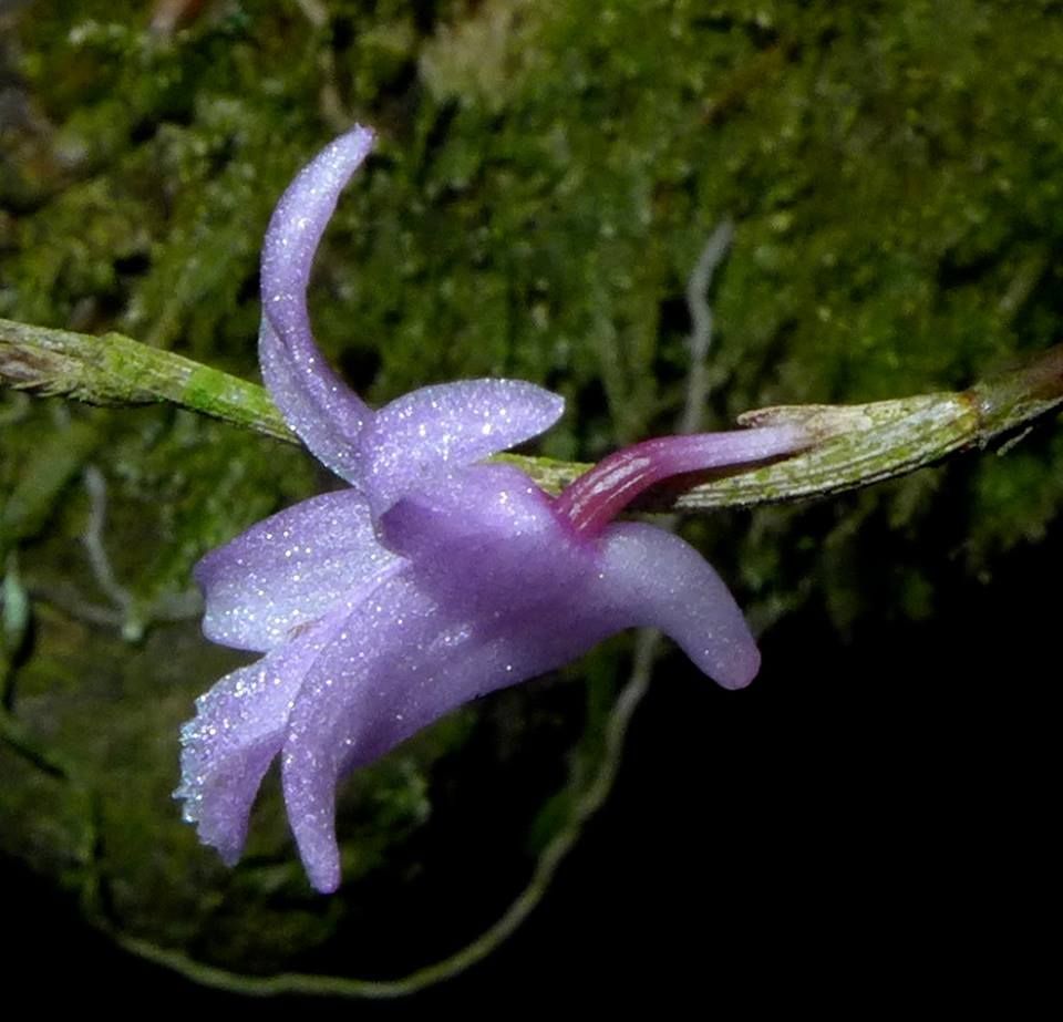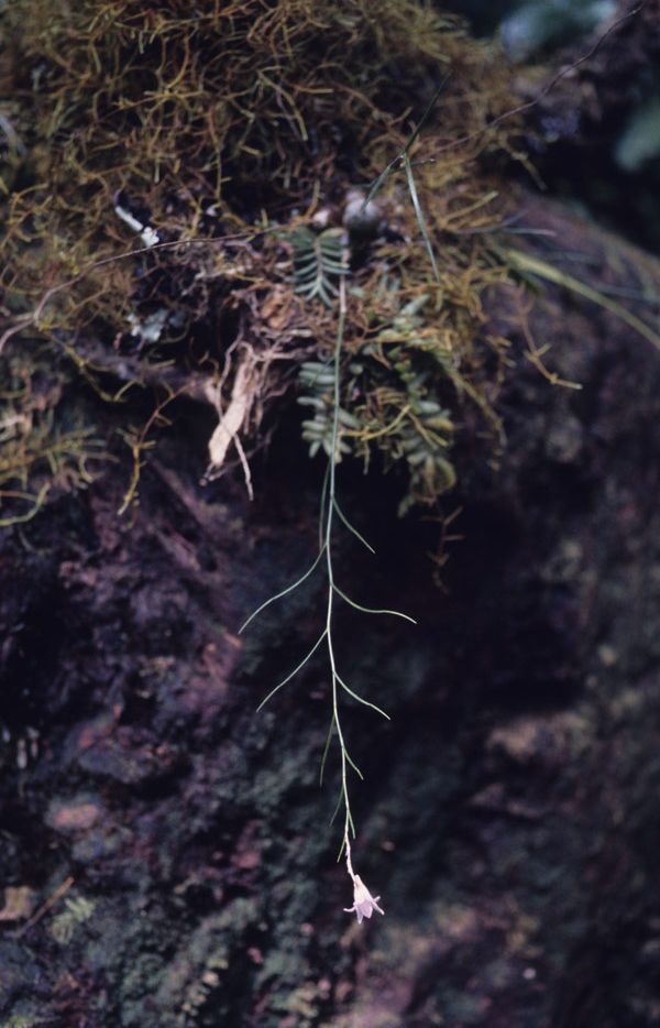 Found in Java, Sumatra and Borneo in lower montane mossy forests at elevations of 1200 to 1700 meters as a medium sized, cool growing epiphyte with pendent, basally globose, thin, elongate stems carrying spreading, linear to almost terete, channeled on upper side, decreasing in size towards the apex leaves that blooms in the spring on an apical, very short, successively single flowered inflorescence and carrying ephemeral flowers