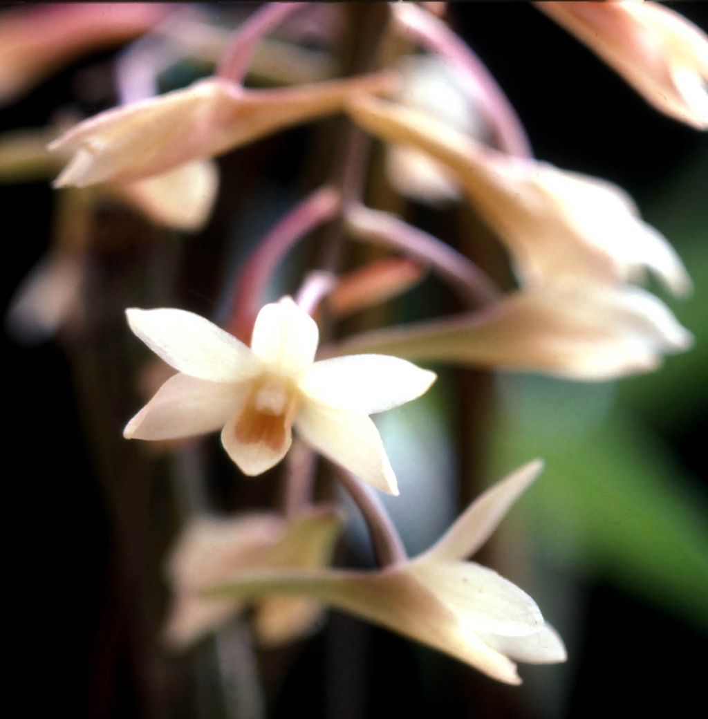Found in the Philippines at elevations up to 500 meters as a medium to large sized, hot growing epiphyte with pendant, zig-zag, slender, terete stems carrying 5 to 10, linear-lanceolate, unequally bilobed apically, distichous leaves blooming in the summer on a short to 3" [7.5 cm] long, penduluous, loosely several [15] flowered inflorescence arising opposite the leaves at nodes along the leafy stem.
