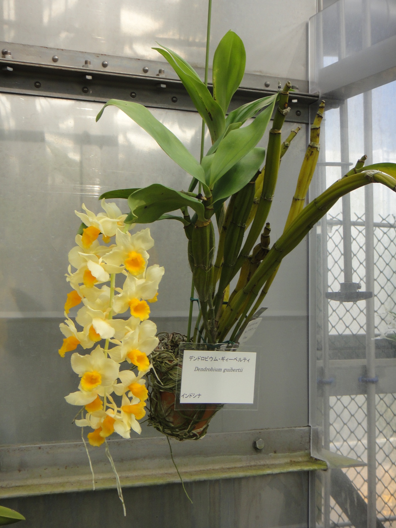 This species has often been cited as a synonym of D densiflorum but this one differs in the much longer stems, the later summer flowering inflorescence, the erose margined petals, the deep orange lip with lighter colored petals, the lip that surrounds the column completely and the angular hole created by the lip. D griffithianum is also similar, especially the flowers, but the plant of D griffithianum has thick pseudobulbs while D guibertii has elongate canes.