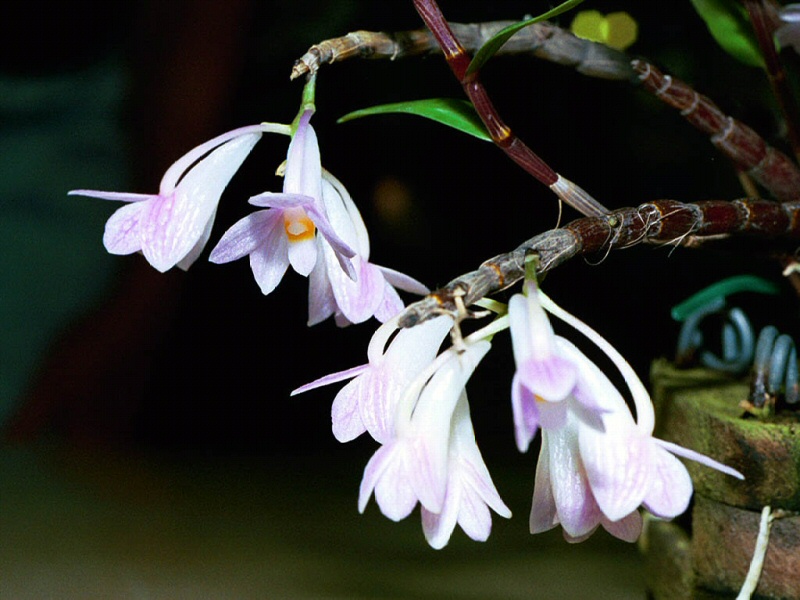 Found in penninsular Malaysia, Java and Sumatra at altitudes of 1500 to 3000 meters as a small to large sized, cool to cold growing epiphyte on ridges in high mountain, moss forests with slender, fractiflex, short and erect to pendant and long stems carrying many, thin, lanceolate leaves which blooms on a very short, axillary, racemose, few flowered, honey scented inflorescence, several arising from the leaf nodes at the apex of leafless parts of mature canes occuring in the late summer and fall. Plants should be allowed to somewhat dry up between waterings for 2 to 3 months in the winter.