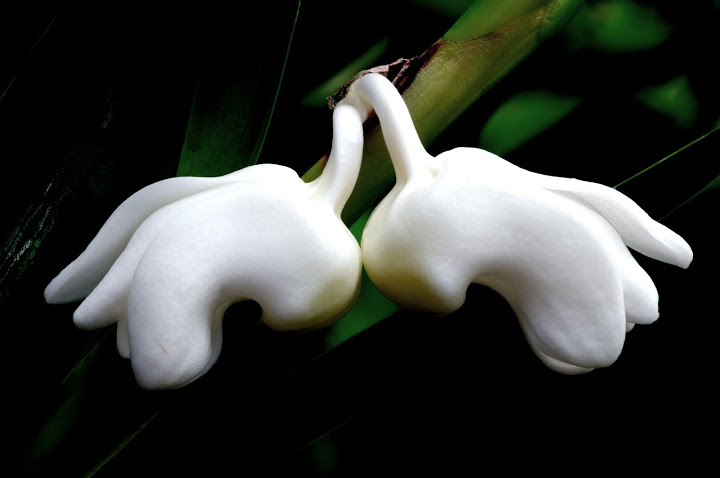 Found in New Guinea in forests at elevations around 1200 to 2700 meters as a large sized, cool to cold growing epiphyte with elongate, flexuous, glabrous, slighly compressed canes carrying suberect, ovate, obtuse, sub-carinate, subpetiolate base leaves that blooms in the fall on a subsessile, short, 2 flowered inflorescence