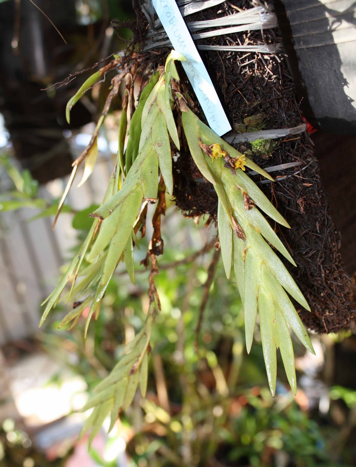 Found in Borneo in mangrove forests at elevations near sea level as a mini-miniature sized, hot growing epiphyte with clustered stems carrying 7 to 9, linear-lanceolate, laterally compressed, 2 ranked leaves that blooms in the late fall and early winter on a short, on the side and towards the apex, successively single flowered inflorescence carrying fleshy flowers
