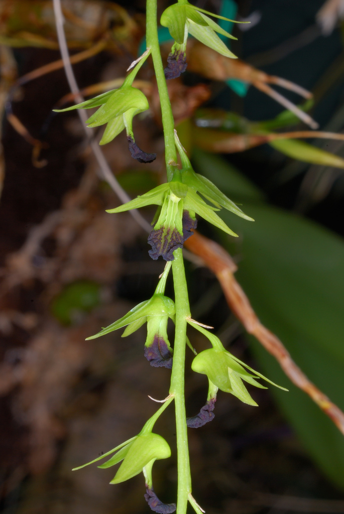 Found in Vietnam at elevations of 1400 to 1500 meters as a small sized, cool growing epiphyte or terrestrial with cylyndrical, angled at each node stems carrying many, deciduous, oblong to oblong-lanceolate, very thin, membraneous, slightly distichous leaves that blooms in the fall and winter on a pendant, very slender, 8" [20 cm] long, few [1 to 3] flowered inflorescence arising from the nodes along the stem with fragrant flowers.