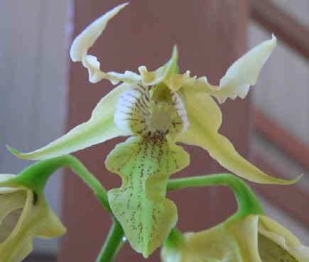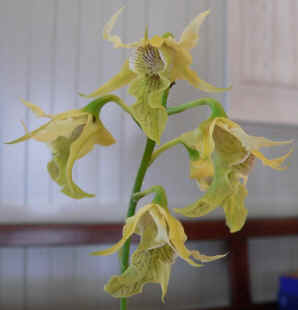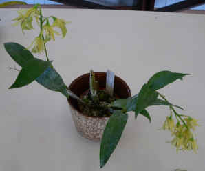 Found in New Guinea as a small to medium sized, hot to warm growing epiphyte with 4 noded, yellow stems carrying towards the apex, 2 to 3, bright green, elliptic to ovate, erect leaves that blooms in the late winter and early spring on a 6 to 8” [15 to 20 cm] long, 2 to 7 flowered inflorescence arising from the nodes at the apex of the stem and carrying nodding flowers
