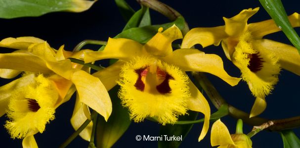 Found in Bangladesh, Assam, the eastern Himalayas and Myanmar in warm valleys at elevations of 1000 to 2000 meters as a small, medium to large sized, cool growing epiphyte or lithophyte on lava rocks with yellowish, pendulous to arching, rod-like canes with basal pseuobulbous swellings that continue to elongate for many seasons and carrying several, dark green, papery, oblong-lanceolate, wavy margined leaves that blooms in the summer and fall on a slender, drooping, 6" [15 cm] long, 9 to 12 flowered inflorescnece with 2 to 4 flowers in groups arising from near the apex of the previous years cane and carrying large fragrant flowers.
