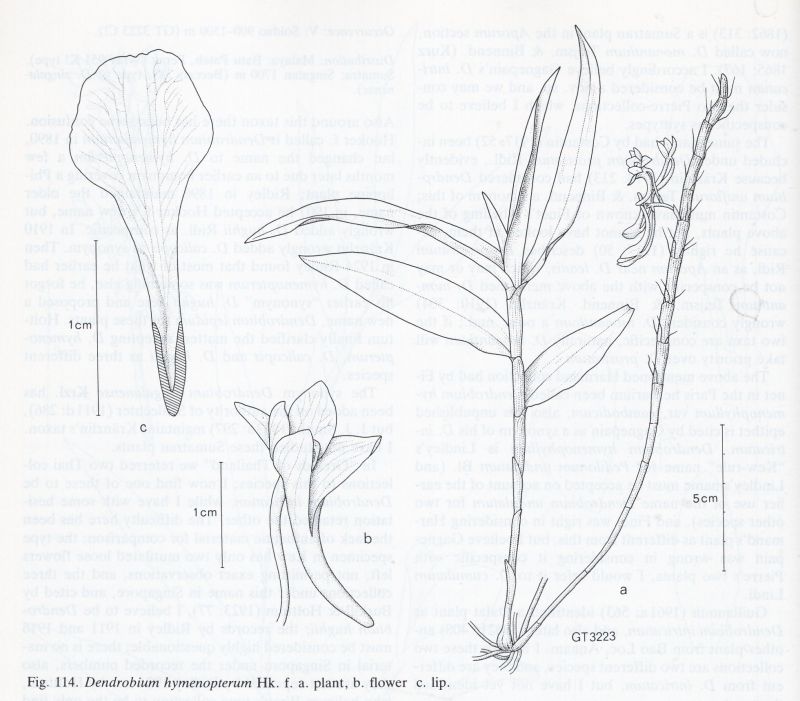 Synonyms Callista hymenoptera (Hook.f.) Kuntze 1891; Dendrobium hymenanthum Hook.f. 1890; Dendrobium singalanense Kraenzl. 1910; Eurycaulis hymenanthus M.A.Clem. 2003; Eurycaulis singalanensis (Kraenzl.) M.A.Clem. 2003; Pedilonum hymenopterum (Hook.f.) Rauschert 1983