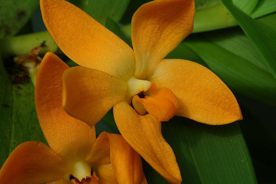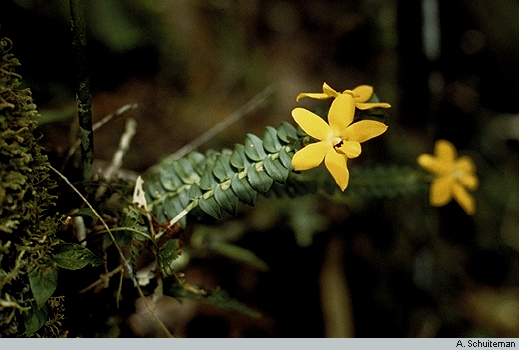 Found in western New Guinea at lower elevations on trees in swamps or in primary forests as a medium sized, hot to warm growing epiphyte with clustered, somewhat flattened stems carrying many, distichous, imbricating, all in one plane, elliptic leaves and blooms in the late winter on a very short, 2 flowered inflorescence.