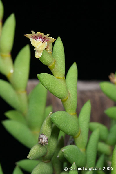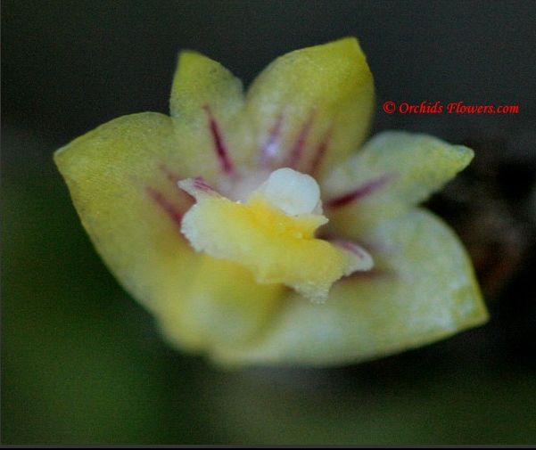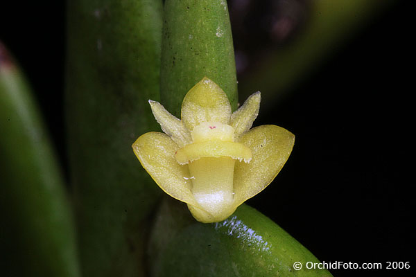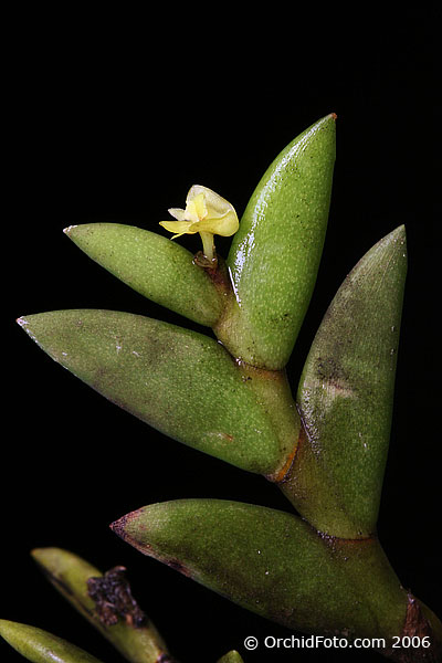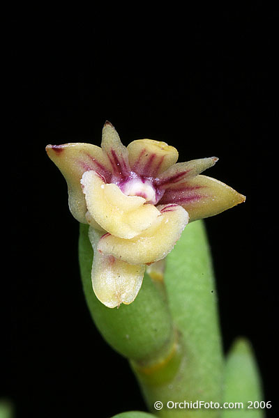 Found in Myanmar, Thailand, Vietnam, Malaysia, Sumatra, Java, Borneo, and the Molucca Islands in semi-deciduous and deciduous dry lowland forests and savana-like woodlands as a small to medium sized, hot to cool growing epiphyte at elevations of 400 to 1600 meters with curved, unbranched, leafy stems carrying, many, lanceolate, imbricating, spreading leaves that blooms on a very short inflorescence with a single, tiny, fan-shaped flower arising from the bases of the numerous imbricate leaves occuring in the summer to winter.