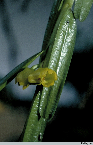Found in New Guinea in lowland and beach forests at elevations of sealevel to 150 meters as a medium sized, hot growing epiphyte with erect, unbranched, laterally compressed stems enveloped completely by leaf bearing sheaths and carrying many, erect, coriaceous linear, unequally and obtusely bilobed apically leaves that blooms at any time of the year on a subsessile, lateral from the stem, 2 flowered inflorescence arising through a very small, broadly obtuse spathe.