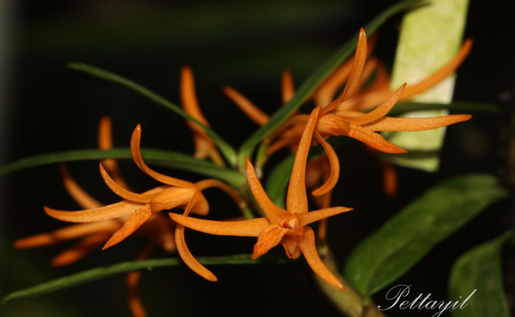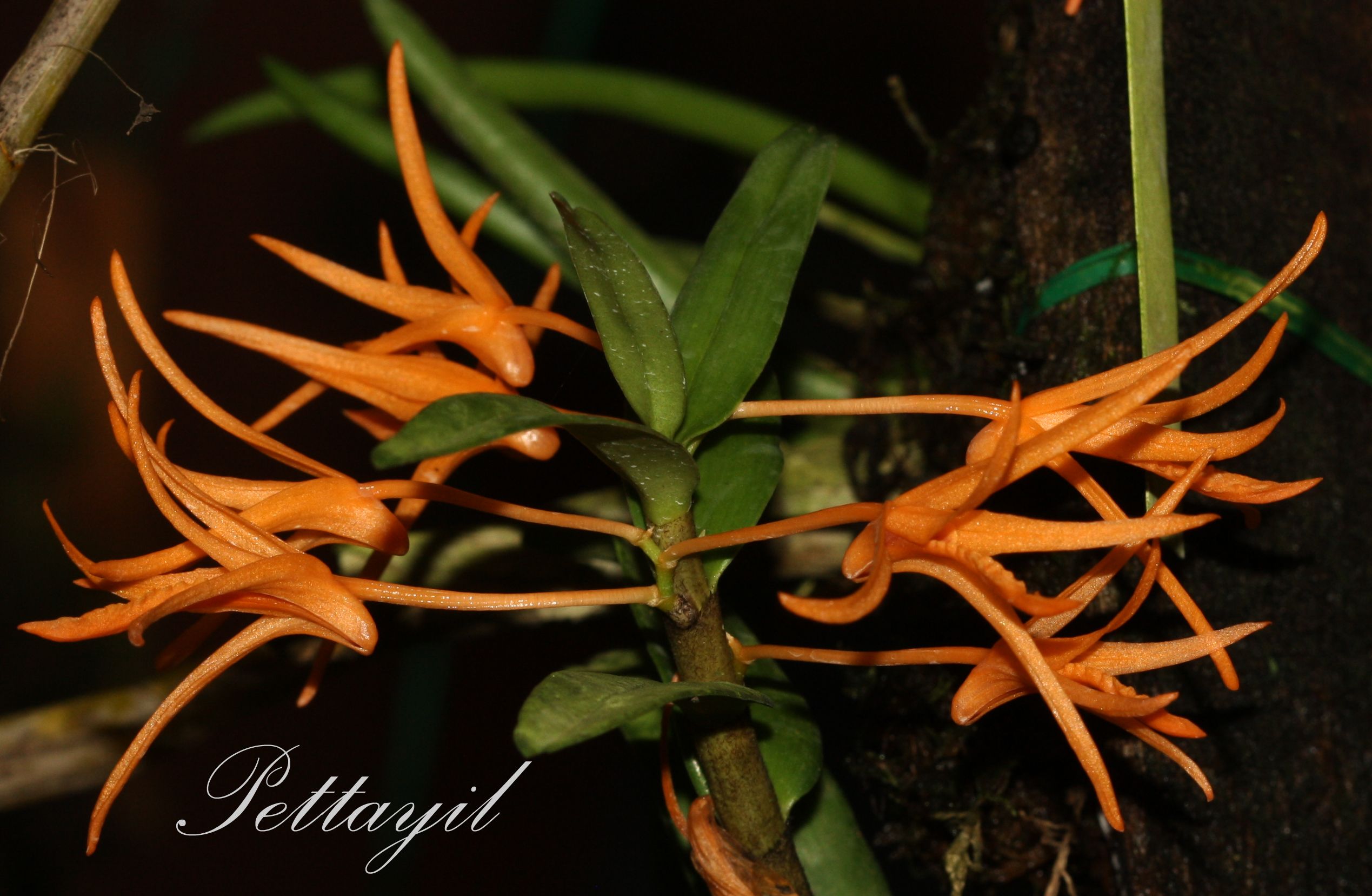 Found in southern India and Sri Lanka in tropical wet evergreen forests at elevations of 800 to 2000 meters as a miniature sized, warm to cool growing epiphyte with grooved, swollen towards the apex, zigzag with few to many angles, yellowish, black hairy stems carrying 3 to 6, distichous, succulent, stiffly leathery, dark green, linear-lanceoalte to linear-oblong, apically bilobed leaves that blooms in the later spring, summer and earlier fall on 2 to 3, short, from opposite and above the leaf axils 2 to 4 flowered inflorescence with triangular-ovate, acute to subacute, 1 veined floral bracts carrying orange, yellowish, pink to greenish white flowers.