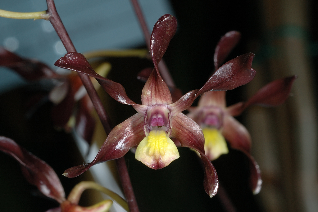 This small to large sized, hot to warm growing epiphytic species that comes from northeastern Australia and Papua and New Guinea in and around rainforests and swamps with scarce winter rain and high light has densely clustered, brown, unevenly swollen pseudobulbs carrying 3 to 8, on the apical one quarter, lanceolate, dark green, tough, thick leaves that are sharply pointed apically. The bloom season is mainly from spring through fall and winter occuring on a 6 to 20" [15 to 50 cm] long, axillary, several to many [2 to 20] flowered, racemose inflorescence with waxy, glossy, fragrant [not so nice], longlasting flowers that arise from the nodes at the apex of leafy and leafless canes.