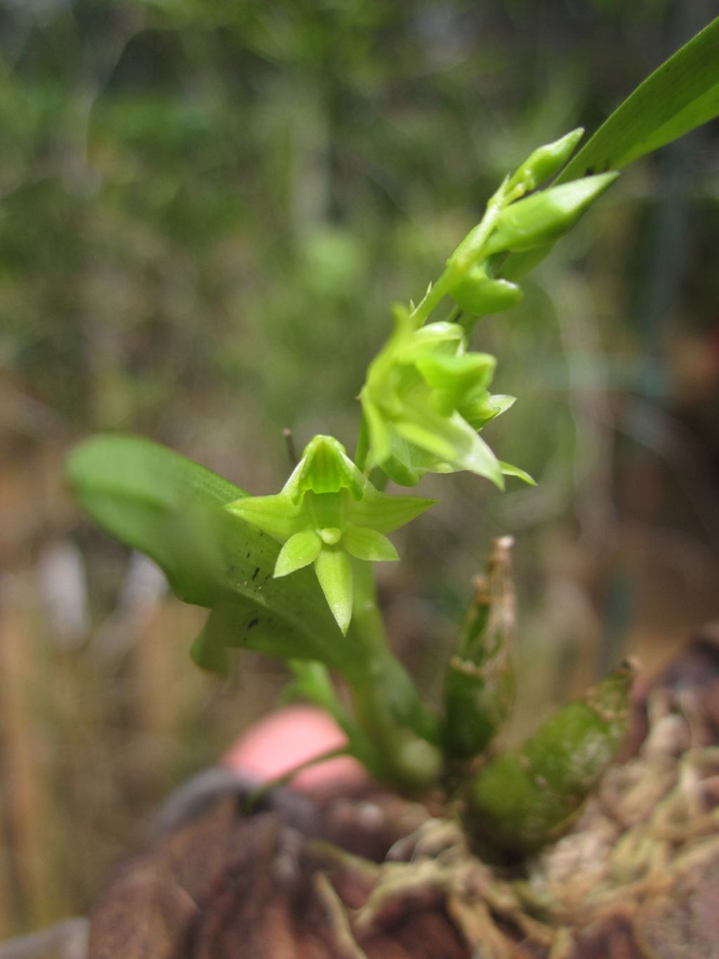 Found in Thailand at elevations of 200 to 600 meters as a mini-miniature sized, hot growing epiphyte with close set, fat, nearly conical pseduobulbs carrying 3 to 4, broad, unequally bilobed apically leaves that blooms in the summer and early fall on 1 to 2, axillary, 1.2" [3 cm] long, 6 to 10 flowered inflorescence arising on nodes at or near the apex of newly emerging stems.