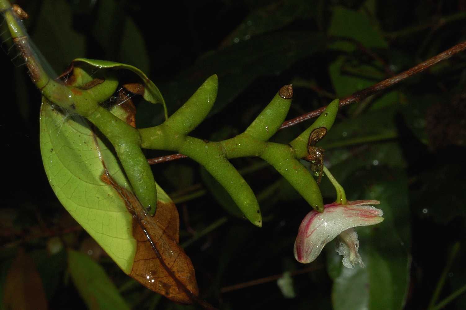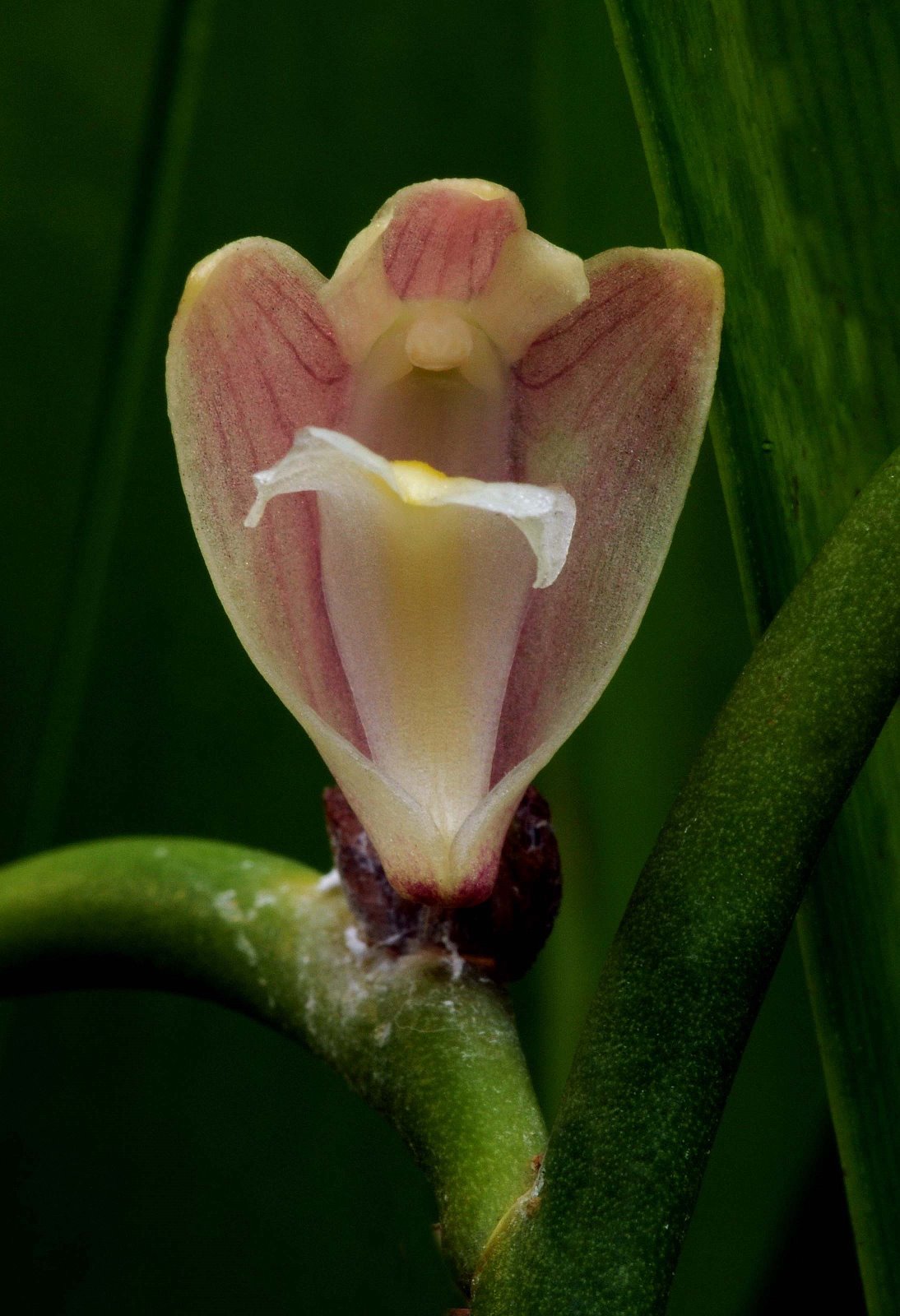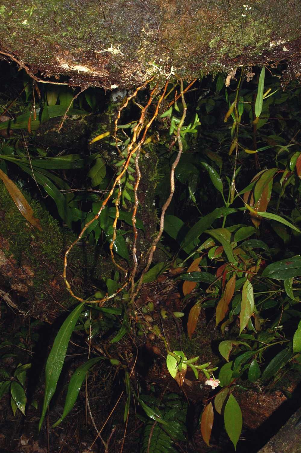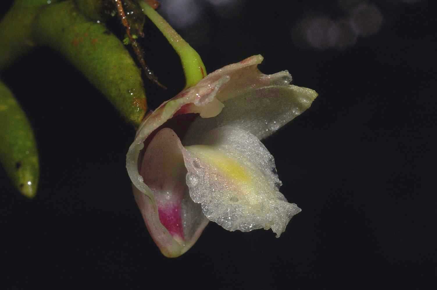 Found in the eastern Himalayas, Laos, Thailand, penninsular Malaysia, Borneo and Sumatra in peat swamp, hill, ridge-top and lower montane forests at elevations of 600 to 1520 meters as a small to medium sized, warm to cool growing epiphyte with thin to stout, zig-zag, simple, erect to pendent stems carrying almost terete, flattened, acute, curved leaves all held in a single plane and blooms in the fall on a short, axillary to lateral, single flowered inflorescence arising at or near the apex of leafy stems and in small clusters on leafless stems.