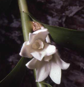 Found in Bougainville New Guinea, the Solomon Islands and Vanuatu in coastal rainforests at elevations of sea level to 500 meters as a medium szied, hot growing epiphyte with slender, pendant stems carrying many, light green, distichous, lanceolate, rough, wrinkled, unequally bilobed apically leaves that blooms in the late winter and early spring on a short, 2 flowered inflorescence and carrying short lived, fleshy, not opening well flowers