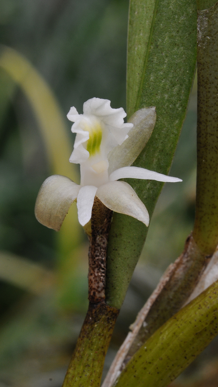 Found in Papua New Guinea in New Britain province in primary forests high in the canopy at elevations of 650 to 850 meters as a small sized, warm growing epiphyte with a branching, branches tufted, elongated, suberect to straggling, filiform, flexuous, glabrous stem-like rhizome enveloped almost completely by a long, persistent, whitish, dried, membraneous scale leaf and carrying a fusiform, nat laterally flattened pseudobulb enveloped almost completely by a whitish, persistent, dried, membraneous scale leaf and carrying apically, a single, sessile, mid green, lighter or so beneath, ovate-linear-lanceolate, thin, rather stiff, narrowly rounded below unequally bilobulate, lobules acute leaves that blooms in the later spring on a fascile at the apex of the pseudobulb on the abaxial side of the leaf, very short, single flowered inflorscence.