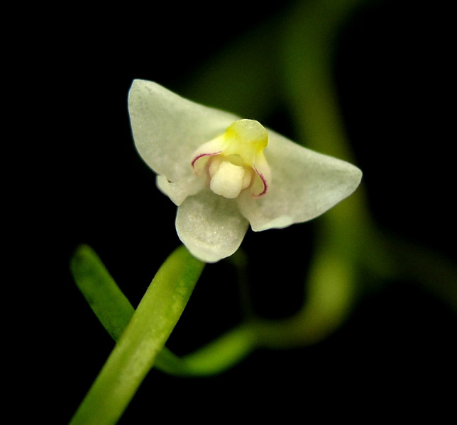 Found in Sabah and Kalimantan Borneo in hill and lower montane forests at elevations of 900 to 2200 meters as a miniature to small sized, warm to cold growing epiphyte with erect to pendant, wiry, 4 ridged stems that often keiki and carrying a few, linear to almost acicular, shallowly "V"-shaped, minutely, acutely unequally bilobed apically, rigid leaves that blooms at most any time of the year on several, on the distal portion of the stem, short, successively few flowered inflorescence