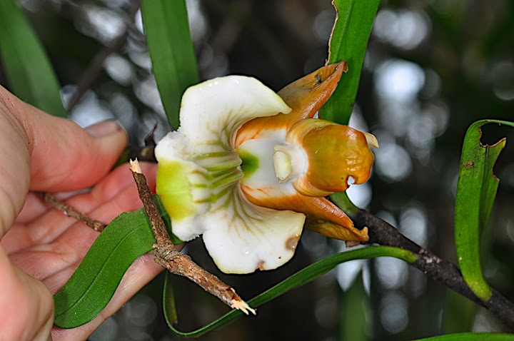 Found in northern Borneo in lower montane forests at elevations around 1100 to 1800 meters as a large to giant sized, cool growing epiphyte with elongate stems enveloped almost entirely by persistent leaf sheaths and carrying many distichous, in youth enveloped by dark brown hairs, ligulate, acutely unequally bilobed apically, articualte basally leaves that blooms in the fall on an axillary, short to 1/4" [7mm] long, single flowered inflorescence held towards the apex of the stem, and carrying a non-resupinate, fleshy, strongly scented flower.