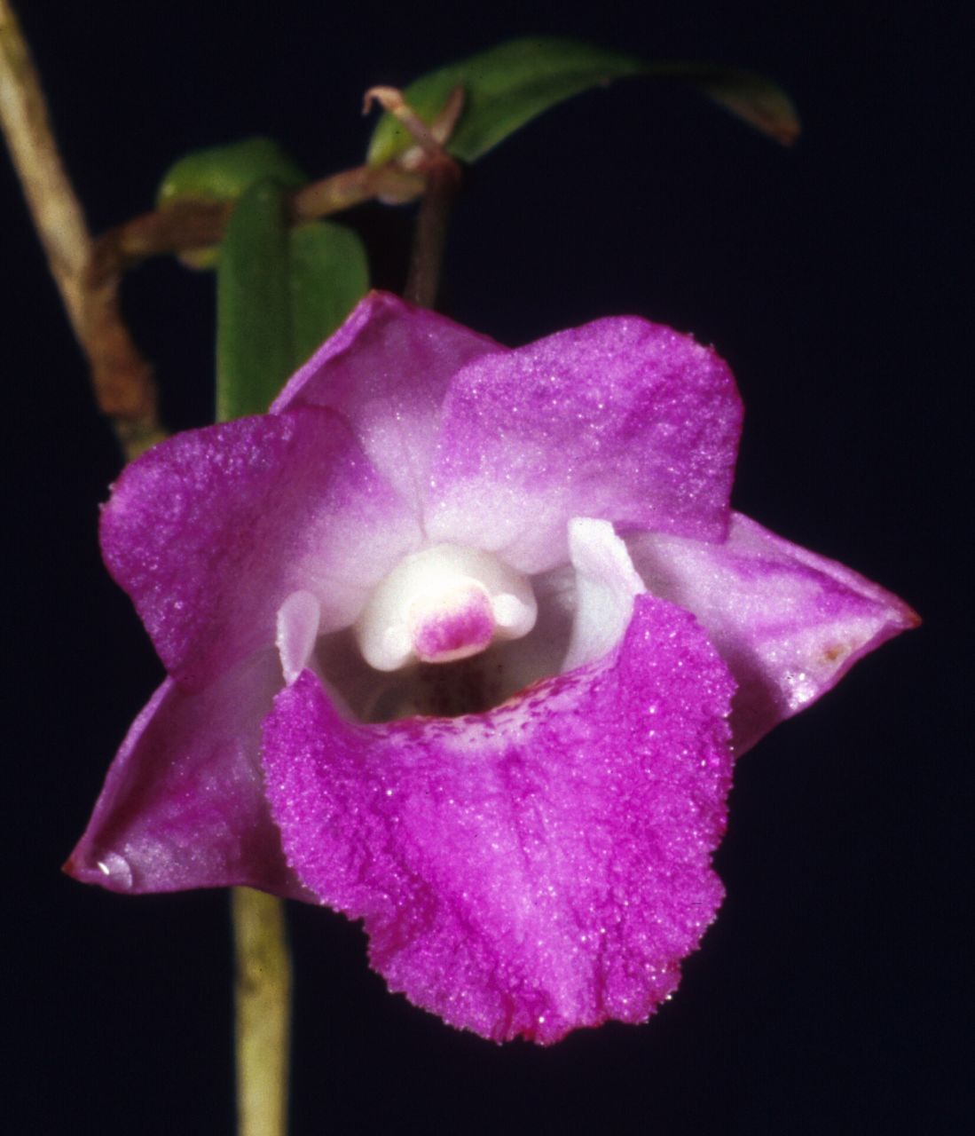 Found in eastern Indonesia and New Guinea in lowland areas along watercourses on dry calcareous ground or on open sunny eastern slopes at elevations of 70 to 1900 meters as a medium sized, hot to cool growing terrestrial in forest litter or calceolaris soil or lithophyte on barren conglomerate rocks with tall, erect, branching, purplish, slightly fractiflex, smooth, leafy stems carrying many, papery, alternating, linear-lanceolate, deciduous leaves that blooms in the spring on an erect, racemose inflorescence with 1 to 4, crystaline flowers that arise on the upper nodes of older, leafless canes.