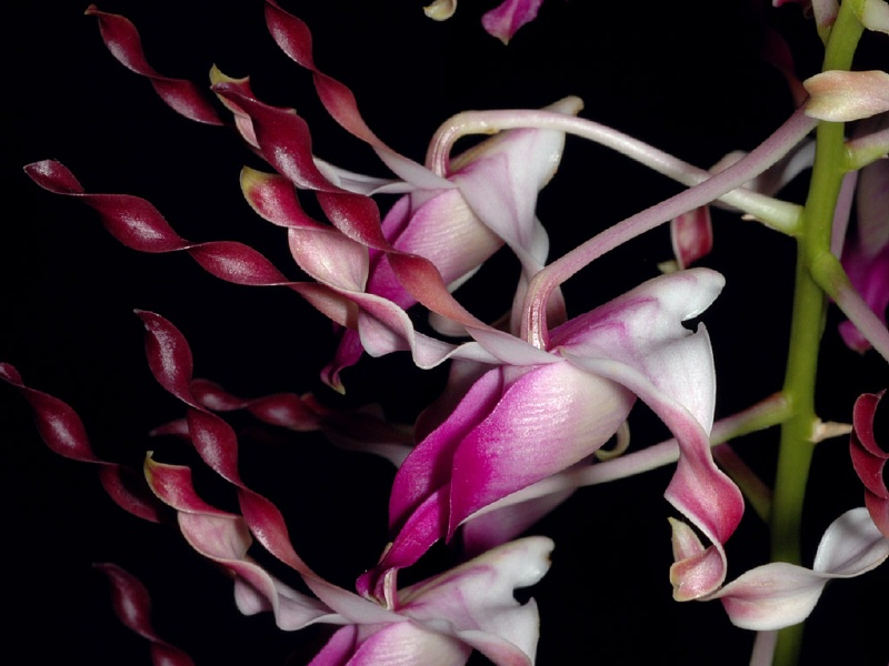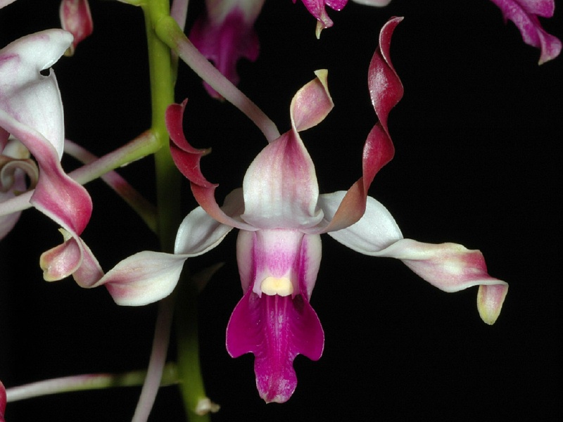 A large sized, hot growing epiphyte from damp, humid river and streams in lowland forests of Papua and New Guinea below 100 meters in elevation with terete, erect stems carrying leaves throughout the length and have elliptic, coriaceous, emarginate, alternate leaves. The bloom season is from spring through autumn on an axillary, medium length to 1 to 2' [30 to 60 cm], several to many [10 to 30] flowered raceme with showy flowers that arises from the nodes near the apex of mature leafy canes with water and fertilizer applied evenly year round.