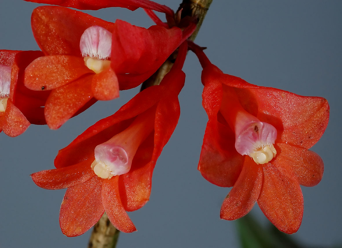 A year round blooming, medium sized, warm to cool growing epiphyte from Papua and New Guinea and Bougainville Island mist forests low on the trees or on the underside of branches at an elevation of 800 to 2000 meters with thin, flattened stems carrying broadly ovate, acute or obtuse, bilaterally flattened, distichous, thick and fleshy leaves that overlap at the base. It has a very short [less than 2", or 5 cm] raceme that arises from the old and new leafless canes with from 1 to 6, pendant, showy, highly variable, floral scented flowers that occur ar most any time of the year.